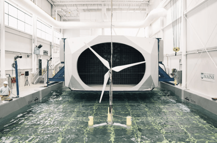 A 1/52-scale model of a floating wind turbine sits in a wind and wave simulator inside the facility of the Advanced Structures and Composites Center at the University of Maine in Orono. Credit Tristan Spinski for The New York Times
