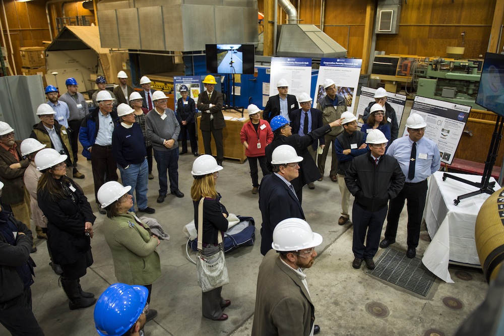 On January 11, 2017, more than 70 members of the 128th Maine Legislature toured the UMaine Advanced Structures and Composites Center as part of the Maine Development Foundation’s Legislative Bus Tour. The tour focused on composites applications in infrastructure, forestry and forest products, and ocean engineering. The group also toured the Forest Bioproducts Research Institute and the Process Development Center, and viewed a presentation by College of Engineering Dean Dana Humphrey on Engineering Teaching and Education as applied to Maine’s economy.