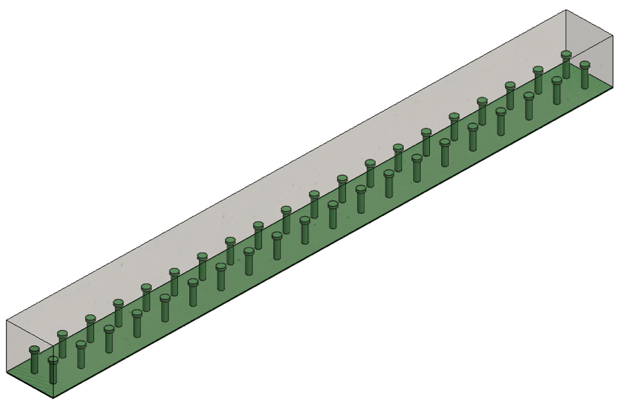 The initial component-level specimens will be hybrid composite-concrete beams as shown in Figure 1. The thermoplastic composite reinforcement in the initial design is PETg reinforced with E-glass fibers, which is used as tensile reinforcement in the beam. Shear is mechanically transferred between the composite and the concrete by thermoplastic shear studs with a T-hat shape. The studs are bonded to the beam by spin-welding (friction welding). The use of thermoplastics in both the tensile reinforcement and the shear studs allows utilization of the formability of the material, which is not possible with thermosets. The initial test of this application will be conducted on 5-ft long beams of the style shown in Figure 1, which will be tested in four-point bending.