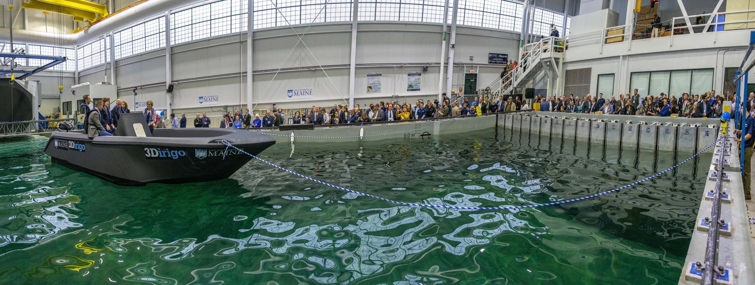 The event culminated with the world’s largest 25-foot, 5,000-pound 3D-printed boat, named 3Dirigo, being tested in the Alfond W2 Ocean Engineering Laboratory, an offshore model testing facility equipped with a high-performance wind machine over a multidirectional wave basin. The ceremony was a milestone in UMaine’s leadership in cutting-edge composite material research and development, and commitment to use Maine’s vast natural resources to drive innovation that generates major economic development opportunities in the state and beyond.
