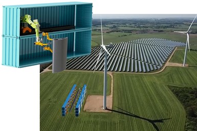A team including Orbital Composites, ORNL and UMaine is aiming to not only advance the use of composite 3D printing to manufacture rotor blade components, but to solve challenges in manufacturing and transportation of increasingly larger wind blades by using on-site, containerized robotic 3D printers. Photo Credit: Orbital Composites