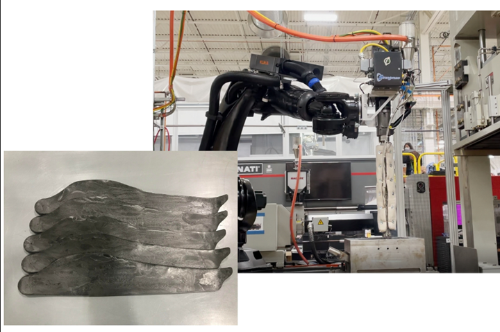Another team, focused on sustainability, is conducting work on lab-scale recycling methods for composite components including wind blades. The system here employs a shredder and waterjet cutter to explore new ways of processing/shredding end-of-life (EOL) parts. Reuse cases are also being evaluated, such as incorporating recycled chopped material into 3D printing pellets to feed back into the BAAM printer.”