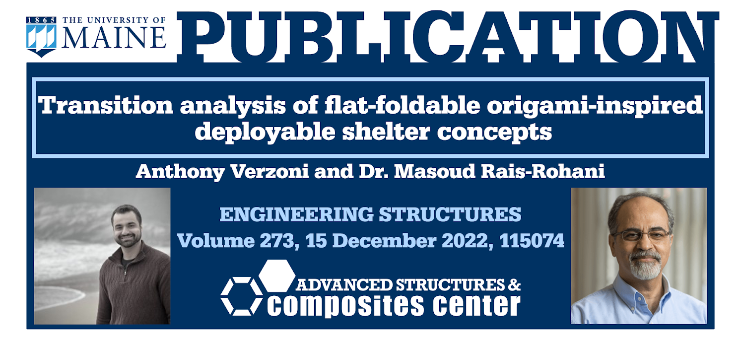 Orono, Maine — An article by ASCC researchers Anthony Verzoni and Masoud Rais-Rohani was published in Engineering Structures. The paper, titled “Transition analysis of flat-foldable origami-inspired deployable shelter concepts,” offers mathematical analysis with computer modeling and motion analysis to verify the loading profile required to erect folded structures and to detail how the loading profile is affected by load location.