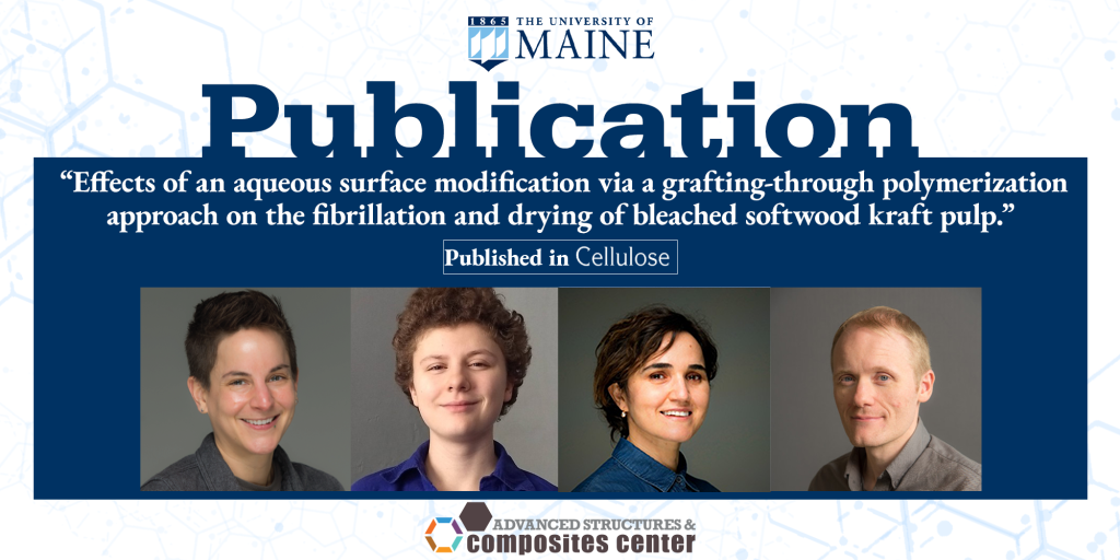 Orono, Maine — An article by ASCC researchers Stephanie Christau, Elif Alyamac-Seydibeyoglu, Kayla Thayer, and William Gramlich was published in Cellulose. The paper is titled “Effects of an aqueous surface modification via a grafting-through polymerization approach on the fibrillation and drying of bleached softwood kraft pulp.”