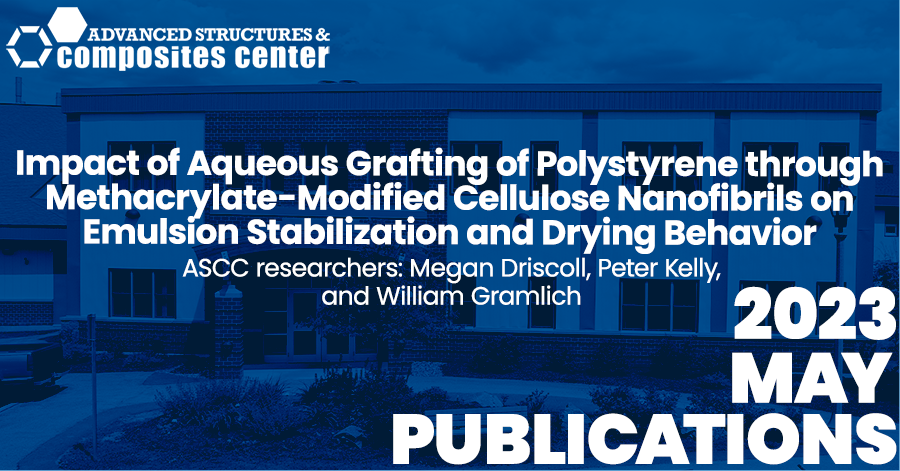 An article by ASCC researchers Megan Driscoll, Peter Kelly, and William Gramlich was published in Langmuir. Titled “Impact of Aqueous Grafting of Polystyrene through Methacrylate-Modified Cellulose Nanofibrils on Emulsion Stabilization and Drying Behavior”, this research explores how the hydrophobic modification of cellulose nanofibrils (CNFs) releases the capability for composite reinforcement including CNFs without energy-demanding spray drying.