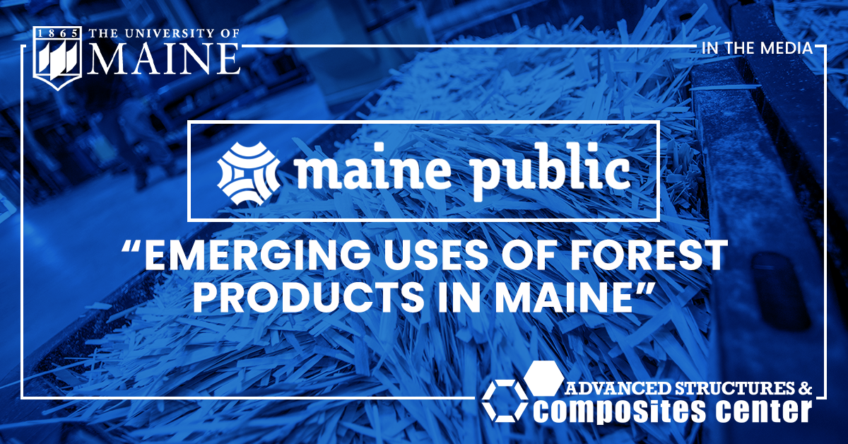 Susan MacKay, a senior R&D program manager at the Advanced Structures and Composites Center, and Hemant Pendse, professor of chemical engineering and founder of the UMaine Forest Bioproducts Research Institute, were featured on Maine Public’s show “Maine Calling” which focused on the emerging innovations of forest products.