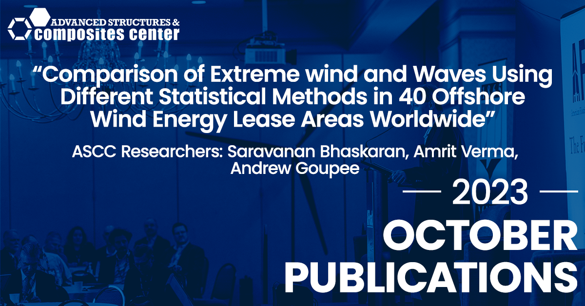 An article by Advanced Structures & Composites Center (ASCC) researchers Saravanan Bhaskaran, Amrit Shankar Verma, and Andrew J. Goupee, along with University of Surrey researcher, Subhamoy Bhattacharya, Norwegian University of Science and Technology researcher, Amir R. Nejad, and Dalian University of Technology Deepwater Engineering Research Center researcher, Wei Shi was published in Energies Journal. The publication titled, “Comparison of Extreme Wind and Waves Using Different Statistical Methods in 40 Offshore Wind Energy Lease Areas Worldwide”, aims to approximately calculate extreme wind and wave conditions spanning multiple newly designated offshore wind lease sites on six continents.