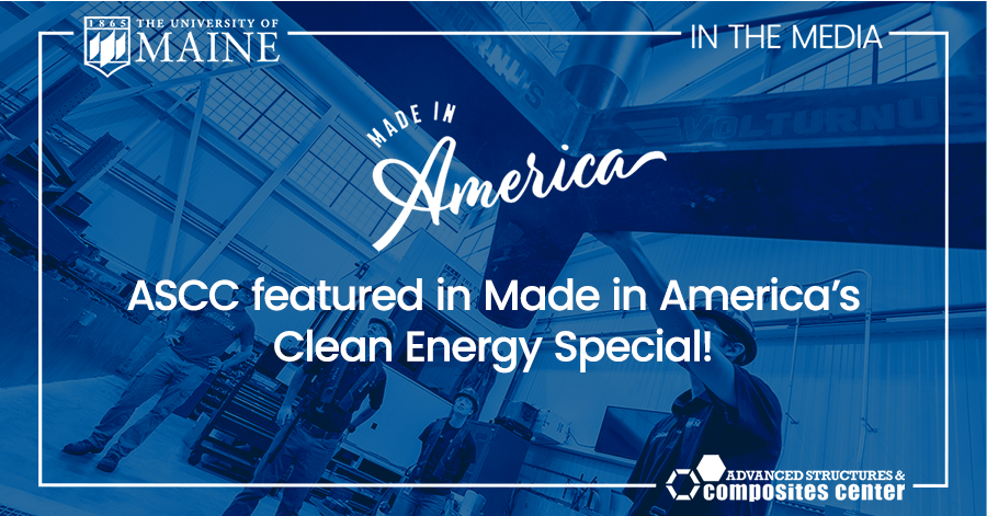 The University of Maine’s Advanced Structures and Composites Center (ASCC) was featured on Made in America’s Clean Energy Special! This special, exhibiting a variety of clean energy solutions. Specifically focusing on our Floating Offshore Wind technology and Ocean Energy Engineering program, Made in America highlights the University of Maine’s ASCC as a leader in climate solutions innovation.