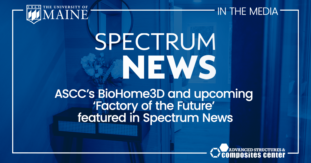 The Advanced Structures and Composites Center’s (ASCC) was featured in a Spectrum News article titled, “Homes from a 3D printer? It’s here, courtesy of the ‘Factory of the Future’ at UMaine Orono.” Featuring the technology behind the world’s first 100% bio-based 3D printed house, BioHome3D!