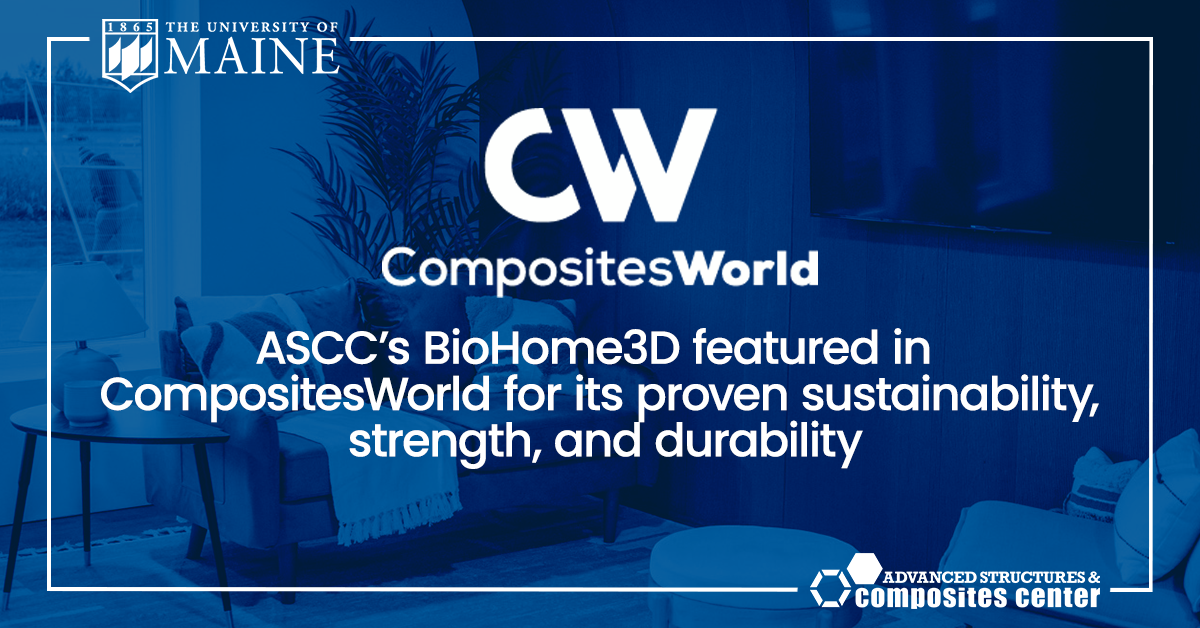 CompositesWorld features the 1-year anniversary of the Advanced Structures & Composites Center’s (ASCC) BioHome3D, the world’s first 100% bio-based 3D-printed house. The article explores the tests we have performed in one year and how it will impact the future of affordable housing in the state of Maine.