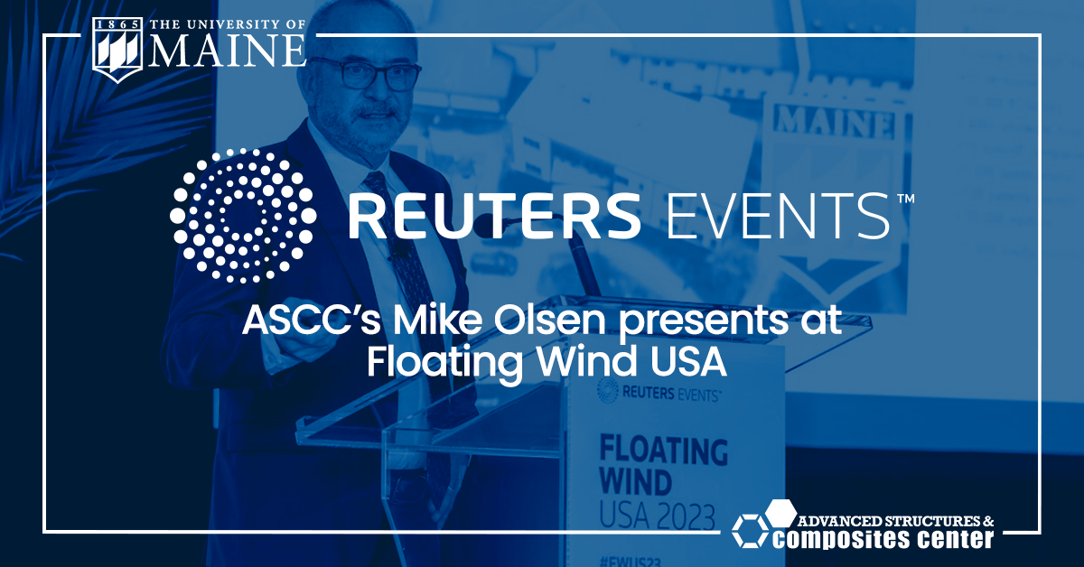 Mike Olsen, The University of Maine Advanced Structures & Composites Center’s (ASCC) Business Development & Commercialization Manager of Floating Offshore Wind, presented “Floating Wind in the Gulf of Maine” at Floating Wind USA 2023 on November 30, 2023 in San Diego, California.