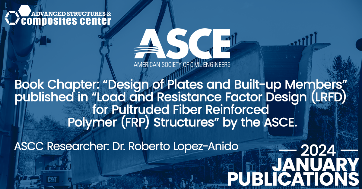 The University of Maine Advanced Structures & Composites Center’s (ASCC) Dr. Roberto Lopez-Anido contributed a chapter “Design of Plates and Built-up Members” published in the American Society of Civil Engineers’ new book, “Load and Resistance Factor Design (LRFD) for Pultruded Fiber Reinforced Polymer (FRP) Structures” (ASCE Press, 2024) pp. 27-29.