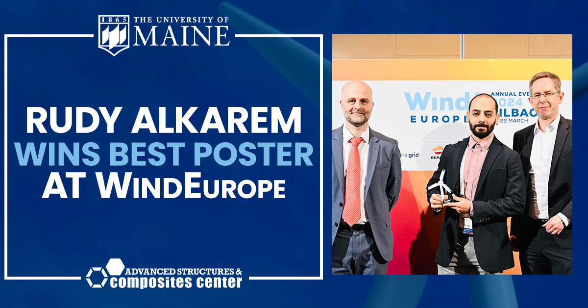 Yuksel “Rudy” Alkarem, a doctoral candidate and research assistant at the ASCC, has won the Best Poster award at WindEurope’s Annual Event for his research; “On Building Predictive Digital Twin Incorporating Wave Predicting Capabilities: Case Study on UMaine Experimental Campaign – FOCAL,”. Alkarem, as well as researchers from the Norwegian University of Science and Technology, and the University of Rhode Island, focuses on improving the performance of floating wind turbines (FWT) by creating a digital twin that accurately represents the physical turbine while being fast to compute.