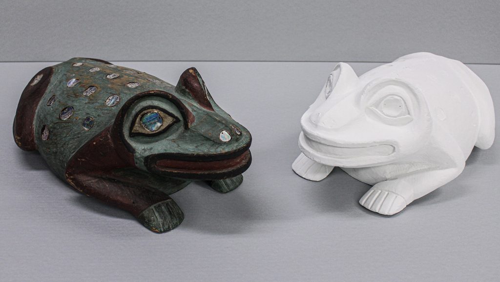 In 2020, the Central Council of Tlingit and Haida Indian Tribes of Alaska requested that the University of Maine’s Hudson Museum return a 19th-century Tlingit frog clan helmet that was part of the museum’s collection. The Hudson partnered with researchers at the Advanced Structures and Composites Center (ASCC), as well as the Intermedia Department to create a 3D-printed replica of the helmet.