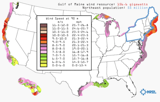 Reduce energy costs over time by reducing transmission costs from remote land sites, simplifying deployment, and simplifying maintenance. In Maine, offshore wind energy represents our largest untapped natural energy resource, with more than 156 GW (1 gigawatt =1,000 megawatts) of potential energy waiting to be harnessed off the coast of Maine. The Gulf of Maine boasts a higher quality offshore wind resource than most parts of the U.S. Mainers currently use 2.4 GW (2,400 megawatts) of electricity each year, however, the Gulf of Maine is located very close to New England populations centers with high electrical demand.